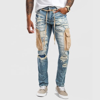 Diseñadores personalizados para hombres, bordado a mano, lijado, cinturón de bigotes, Brighton, cargo, recto, elástico, ajuste Denim Jeans High Street